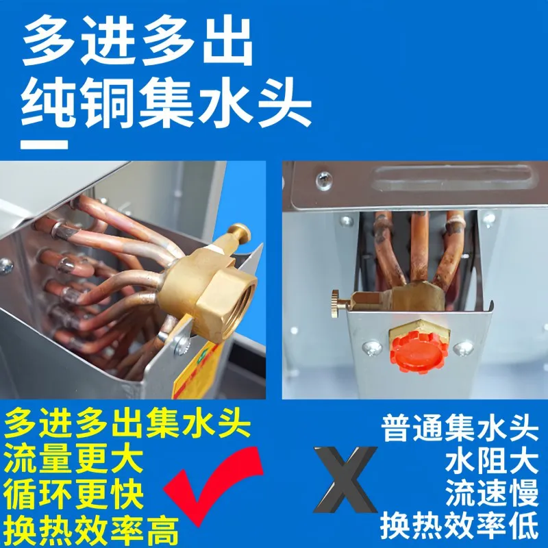 采用纯铜多进出集水头(34WA 3 进 3 出、51WA 4 进 4 出…238WA 10 进 10 出),流量大换热效率高;搭配 30 根纯紫铜管 + 加密亲水铝箔(翅片密度 1.6-1.8mm,高度 210mm),强化冷热交换。