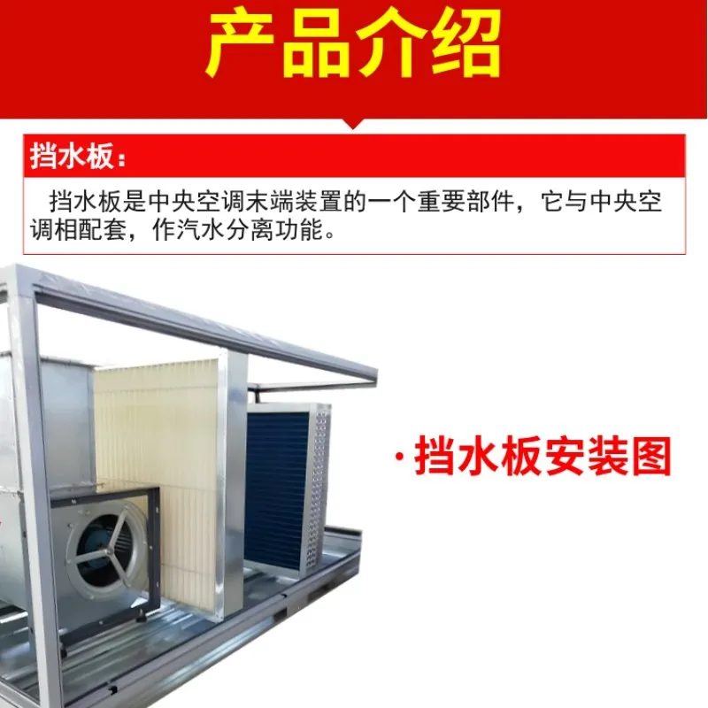 产品采用波浪形沟槽设计,挡水效率≥98%;侧面设排水孔,防积水残留;配备气流方向标识,安装便捷。PVC 款耐温 - 10~60℃,铝合金款耐温 - 30~180℃,均支持大风量工况(适配风量≤10000m³/h),广泛应用于商用、工业空调机组,支持快速出件及定制化生产。