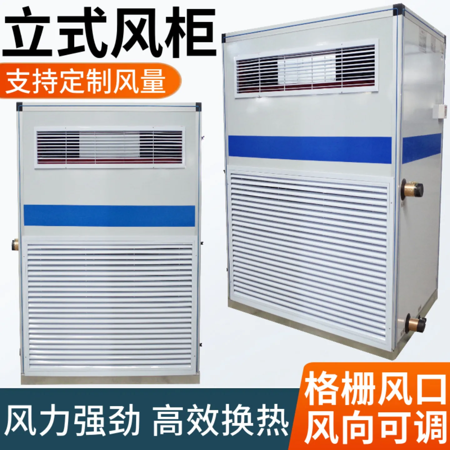 德冷立柜式空调风柜机组支持风量2000-20000cmh按需定制,制冷量15-150kW,制热量25-210kW,适配不同空间温控需求。机组采用纯紫铜管亲水表冷器,高效换热;外转子离心风机动力强劲,帆布连接出风口设计减少风噪。整机尺寸可定制,标准宽度600-1200mm,高度1200-2200mm,支持落地安装。配备百叶可调出风口、加大加宽检修门及抽拉式滤网,风向调节±30°,维护便捷。机身采用镀锌钢板,蓝色条纹装饰,兼具耐用性与工业美学,适用于商场、车间、办公楼等场所。