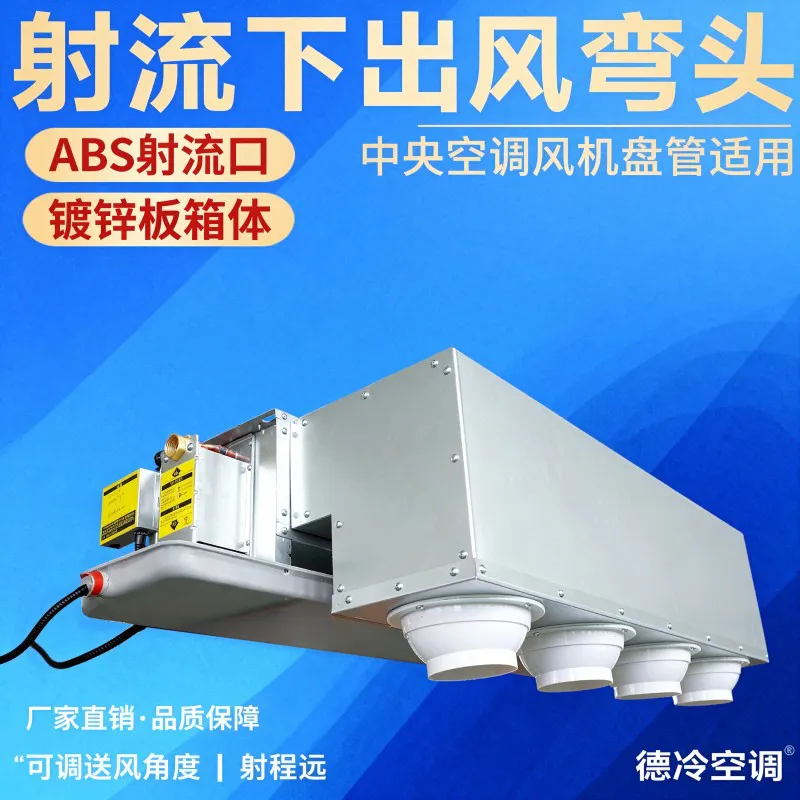 本产品为德州德冷空调专为品牌中央空调风机盘管适配的射流下出风弯头,核心配备 ABS 球形射流风口(直径 9.7cm),送风方向可上下左右调节,实现远距精准送风。