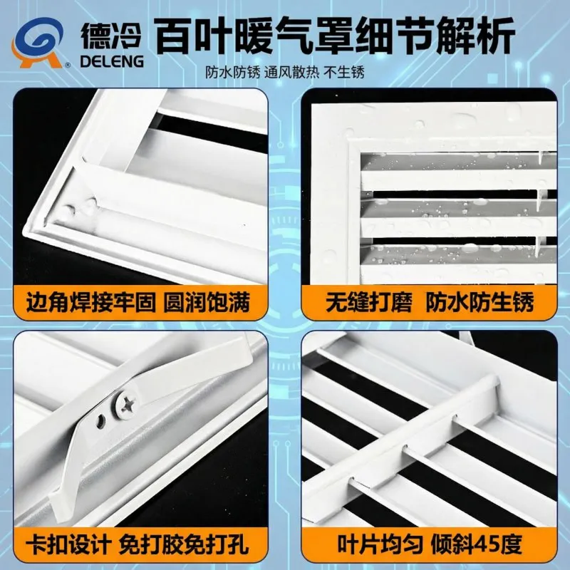 本产品主体采用全铝合金材质打造,具备防水防锈、耐高温、耐腐蚀的特性,表面经无缝打磨处理,触感光滑且易清洁。产品核心采用卡扣式设计,免打孔、免打胶,仅需四步即可完成安装,适配多数墙面洞口。